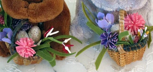 Last year, I crafted with bunnies as well! I bought little plush ones and then created tiny spring baskets for them. That was loads of fun, and another way to add a personal touch to a sweet bunny gift! To do this, I simply purchased some petite florals from my local Michaels craft store, and glued them into mini baskets that I purchased very cheaply and in bulk on ebay. Here’s how they came out: